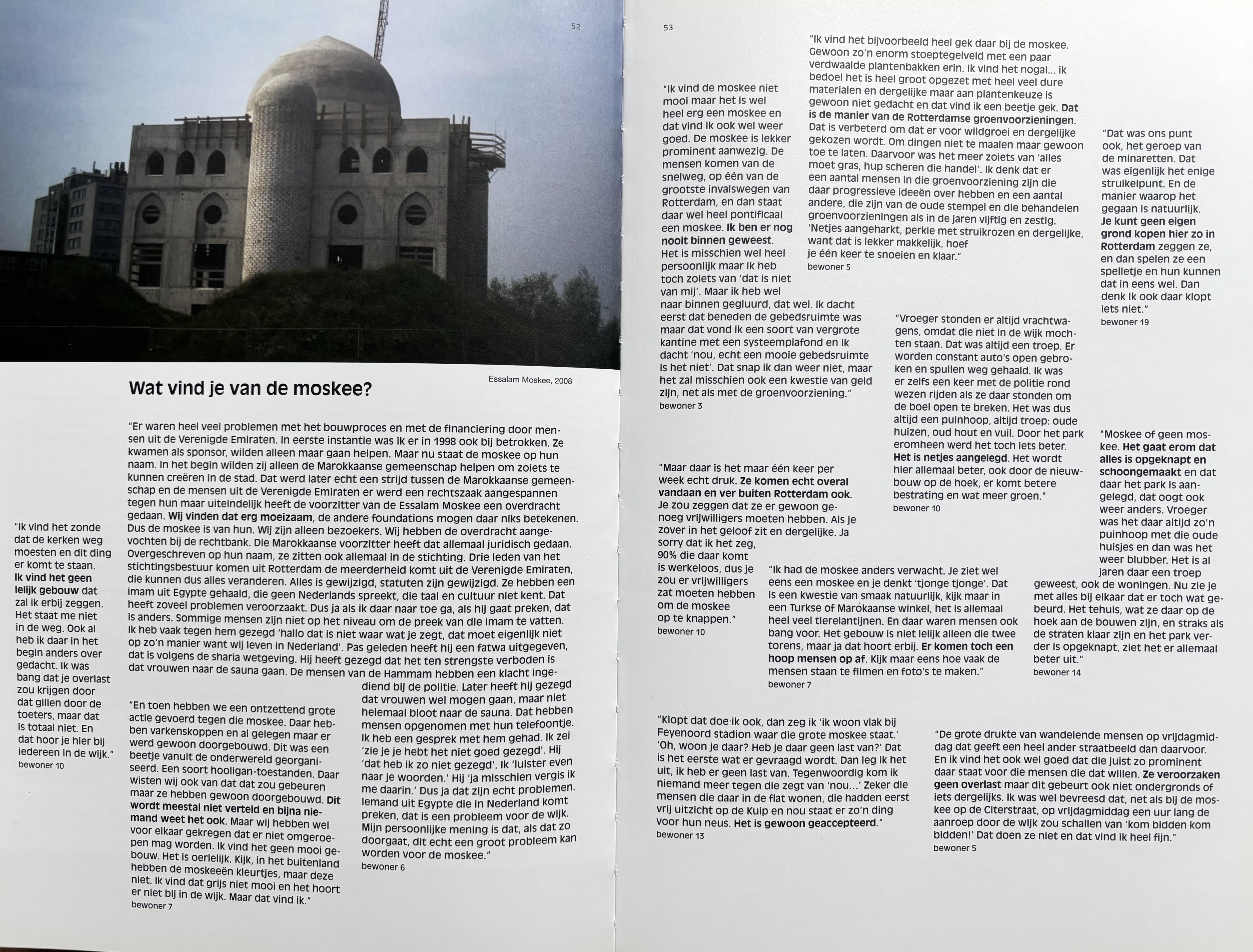 At the time, the area was constantly in the national news as one of the most desperate areas of the Netherlands, labelled as achterstandswijk, vogelaarwijk, krachtwijk. The Essalam mosque was still under construction, and Geert Wilders passed through our streets to film his campaign material. We wondered: what is it actually like to live here?